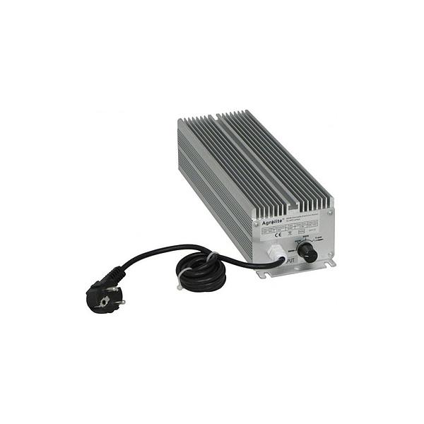 Balastro Electrónico Agrolite 600W HPS/MH El balastro o reactancia, además de ayudar al encendido, se encarga de limitar la corriente en el proceso de descarga. Para el moderno funcionamiento de las lámparas fluorescentes, nos ofrecen una alta eficiencia, larga duración, luz confortable y uniforme basada en la reducción de la pérdida de potencia y el aumento de la eficacia luminosa. Balastro con microprocesador controlado que mantiene el nivel de lúmenes de la lámpara durante más tiempo que los balastros tradicionales. Bajo nivel de encendido a solo 3 A por equipo y protección IP43. Es un equipo que funciona de forma silenciosa y es muy ligero, pudiéndose montar en la pared. Con protección térmica y de circuitos. Encendido rápido. Alcanza su potencia máxima en menos de un minuto, en cambio los balastros electromagnéticos llegan a tardar 20 minutos en estar a pleno rendimiento. Completamente silencioso. Tienes que estar muy cerca del balastro para escuchar un sonido muy débil. Diseño compacto y pequeño. Un balastro de 600 pesa menos de 4 kilos comparado con los 8 kilos del balastro electromagnético. Produce menos calor. Circuito de seguridad. Para proteger el balastro y la lámpara de cualquier daño. Alarga la vida de la lámpara. La pérdida de lúmenes de la lámpara a lo largo del tiempo es drásticamente inferior a la de un balastro convencional. Totalmente compatibles. Puedes conectar lámparas de alta presión de sodio (HPS) y de halogenuros metálicos (HM) preparadas para funcionar sobre balastros de sodio (Sunmaster). Mayor cantidad de lúmenes. De un 20 a un 30 % más de lúmenes que con un balastro electromagnético. Más lúmenes = Más cosecha.