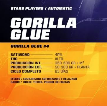 Gorilla Glue Auto es resultado del cruce de nuestro clon autofloreciente de 3ª generación con un clon elite Gorilla Glue #4, obteniendo una planta de estatura media y fácil cultivo, totalmente recomendable para principiantes ya que no necesita cuidados especiales, solo requiere estar bien fertilizada para recompensar con impresionantes producciones. Entregará cogollos de dulce sabor a pino y a tierra, incluso a ponche de fruta en algunos ejemplares. Con un efecto equilibrado que en un principio te pondrá eufórico, para luego relajarte plácidamente, muy recomendable para problemas de estrés, depresión y problemas musculares.
