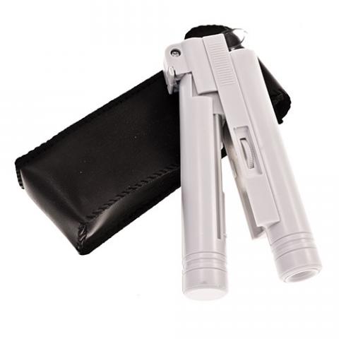 Microscopio portatil con aumento de 150. Con LED para una buena iluminación del objeto. Incluye funda de cuero.