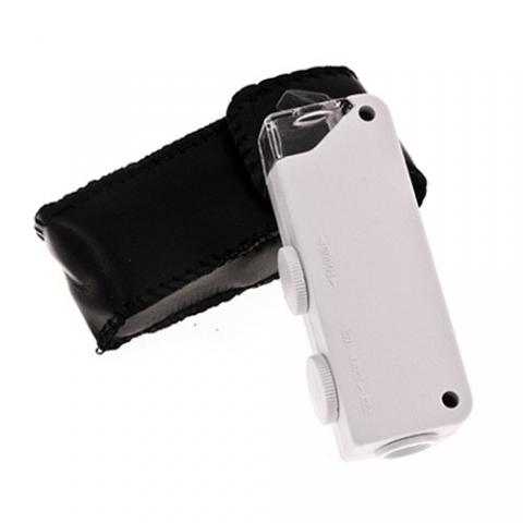 Microscopio portatil con aumento regulable entre 160 y 200. Con LED para una buena iluminación del objeto. Incluye funda de cuero y baterias.