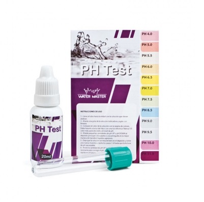 Kit para medición de pH que cuenta con un pequeño tubo de muestra, un líquido reactivo con el que tratar la muestra de agua y una tabla con rangos de pH coloreados para comparar con la muestra. La resolución es de 0,5 puntos y el rango de medición de pH es desde pH 4.0 hasta pH 11.0.